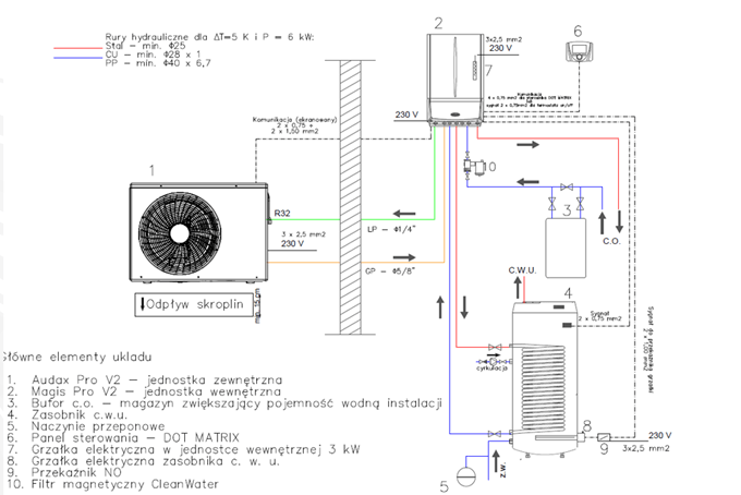 Schemat centralnego ogrzewania (C.O.) to graficzna reprezentacja układu i połączeń wszystkich elementów składowych instalacji C.O. Schemat ten przedstawia sposób, w jaki poszczególne komponenty są ze sobą powiązane i jak przepływa medium grzewcze (zazwyczaj woda) w systemie. Na schemacie znajdziemy takie elementy jak: źródło ciepła, pompy obiegowe, zasobniki c.w.u., przewody i rurociągi, grzejniki i odbiorniki ciepła, zawory, elementy regulujące instalację, sterowniki lub inną automatykę itp.