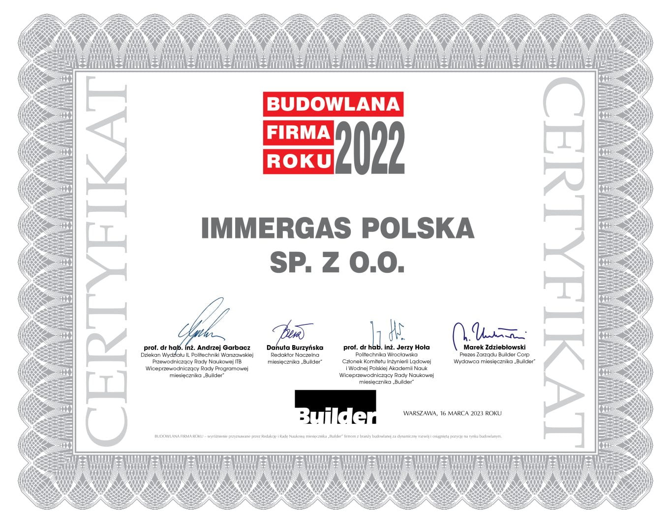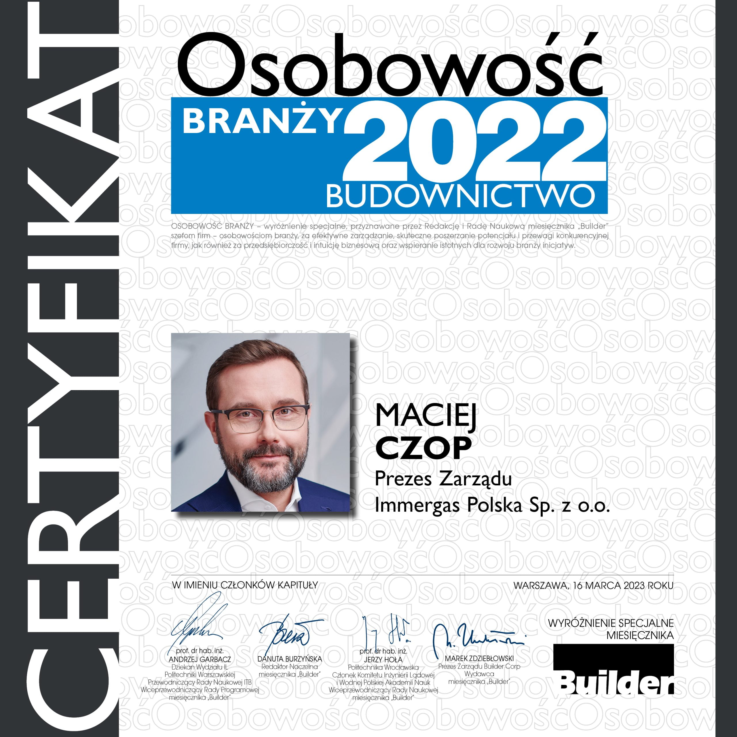 Z wielką radością informujemy, że Maciej Czop – Prezes Zarządu oraz Immergas Polska znaleźli się w gronie laureatów tegorocznej edycji nagród magazynu Builder Polska, zdobywając odpowiednio, wyróżnienia w kategorii OSOBOWOŚĆ BRANŻY oraz BUDOWLANA FIRMA ROKU.