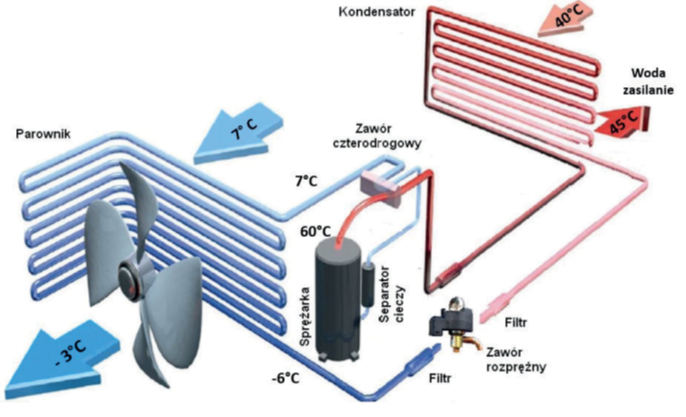 Zamontowany w jednostce zewnętrznej wentylator (lub wentylatory) w wyniku swojej pracy, powoduje przepływ powietrza zewnętrznego przez parownik. Płynący przez parownik czynnik chłodniczy pobiera ciepło z otaczającego go powietrza, wskutek czego wzrasta jego temperatura i zaczyna odparowywać (przechodzi ze stanu ciekłego w gazowy). W kolejnym etapie odparowany czynnik trafia do sprężarki, gdzie wzrasta jego ciśnienie oraz temperatura. Gorący gaz trafia w tym momencie do wymiennika ciepła – skraplacza. W skraplaczu następuje wymiana ciepła pomiędzy gorącym czynnikiem chłodniczym, a wodą powracająca z instalacji CO budynku. Woda „odbiera” ciepło z czynnika chłodniczego, który zaczyna się skraplać i ochładzać. Dalej czynnik płynie już do zaworu rozprężnego, gdzie na skutek rozprężania spada jego ciśnienie i temperatura. Rozprężony i ochłodzony czynnik znów wpływa do parownika i kolejny cykl rozpoczyna się od nowa.