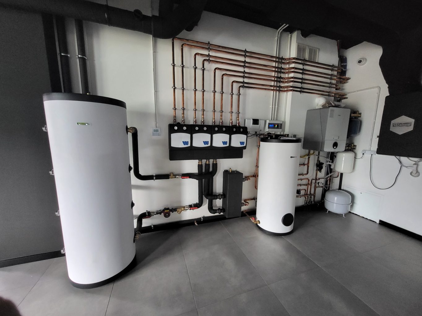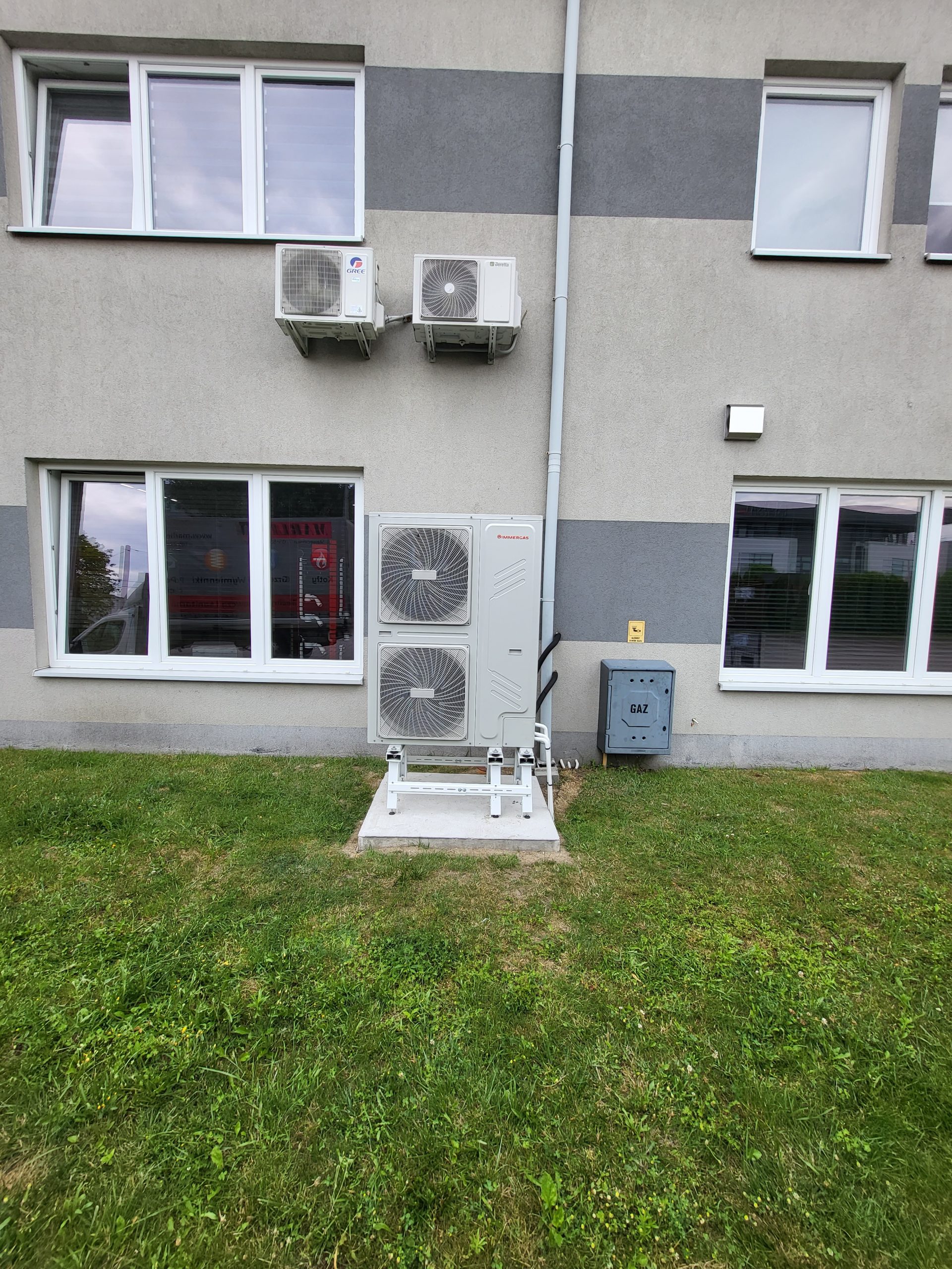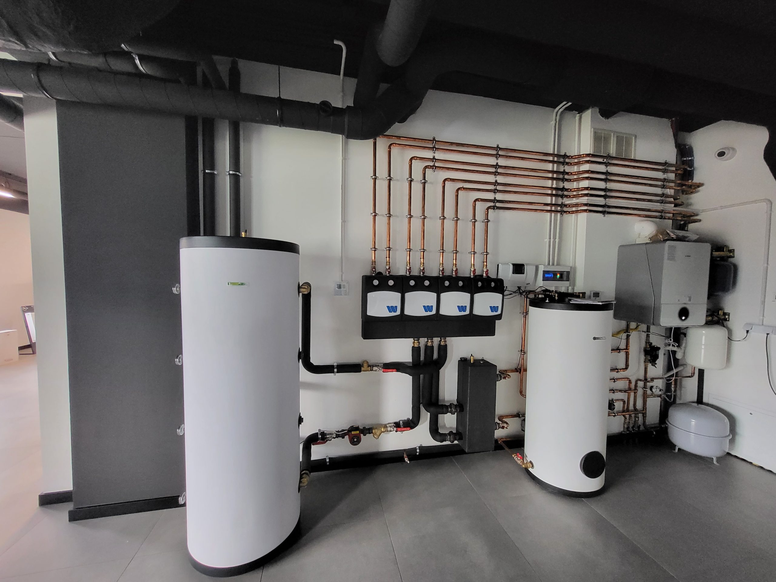 Na potrzeby ogrzewania budynku zastosowano pompę ciepła typu monoblok Magis M30 T, która stanowi podstawowe źródło ciepła. Dla zapewnienia maksymalnego bezpieczeństwa system współpracuje z kotłem gazowym o mocy 60 kW, pełniącym rolę źródła szczytowego oraz rezerwowego w warunkach zwiększonego zapotrzebowania. Układ obejmuje także system przygotowania ciepłej wody użytkowej, dostosowany do bieżących potrzeb obiektu, z zapewnieniem komfortu i ciągłości dostaw.