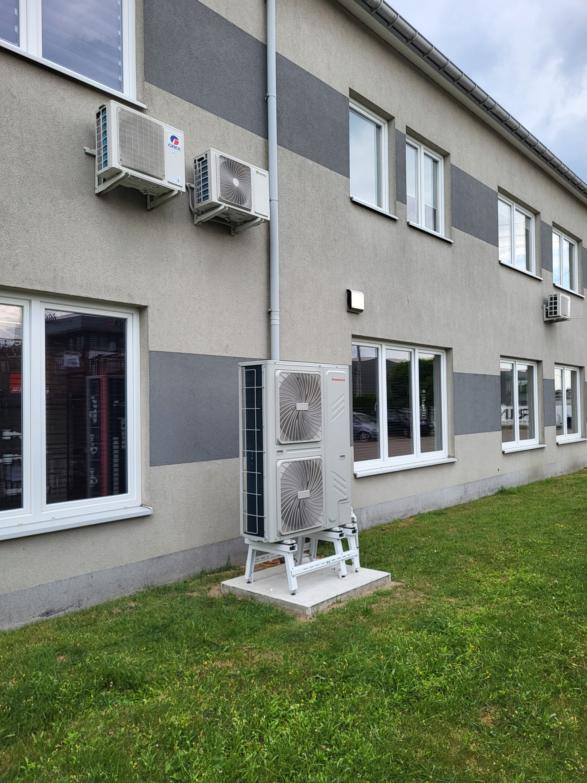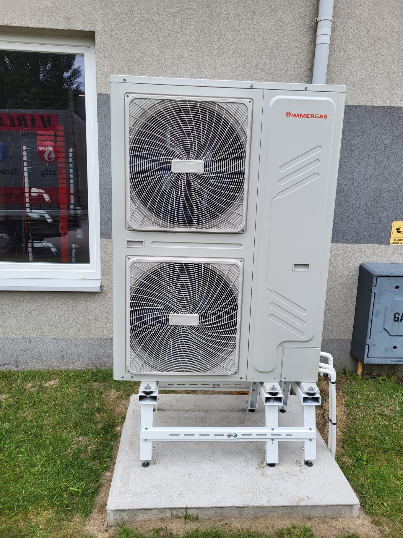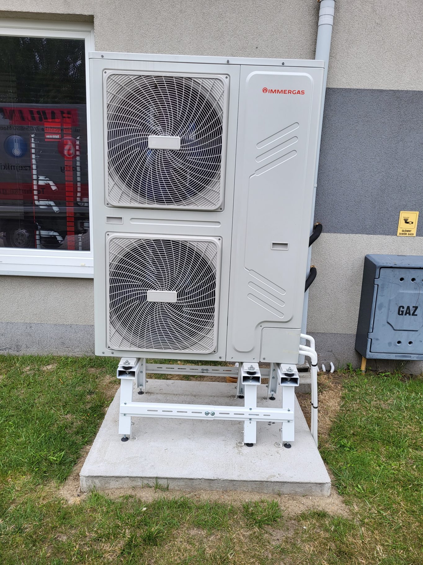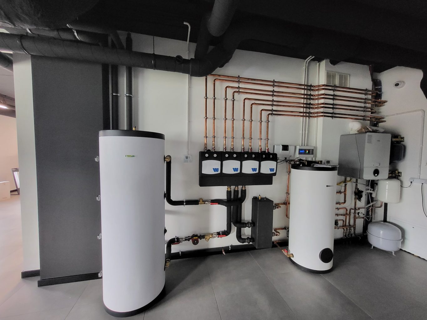 Na potrzeby ogrzewania budynku zastosowano pompę ciepła typu monoblok Magis M30 T, która stanowi podstawowe źródło ciepła. Dla zapewnienia maksymalnego bezpieczeństwa system współpracuje z kotłem gazowym o mocy 60 kW, pełniącym rolę źródła szczytowego oraz rezerwowego w warunkach zwiększonego zapotrzebowania. Układ obejmuje także system przygotowania ciepłej wody użytkowej, dostosowany do bieżących potrzeb obiektu, z zapewnieniem komfortu i ciągłości dostaw.