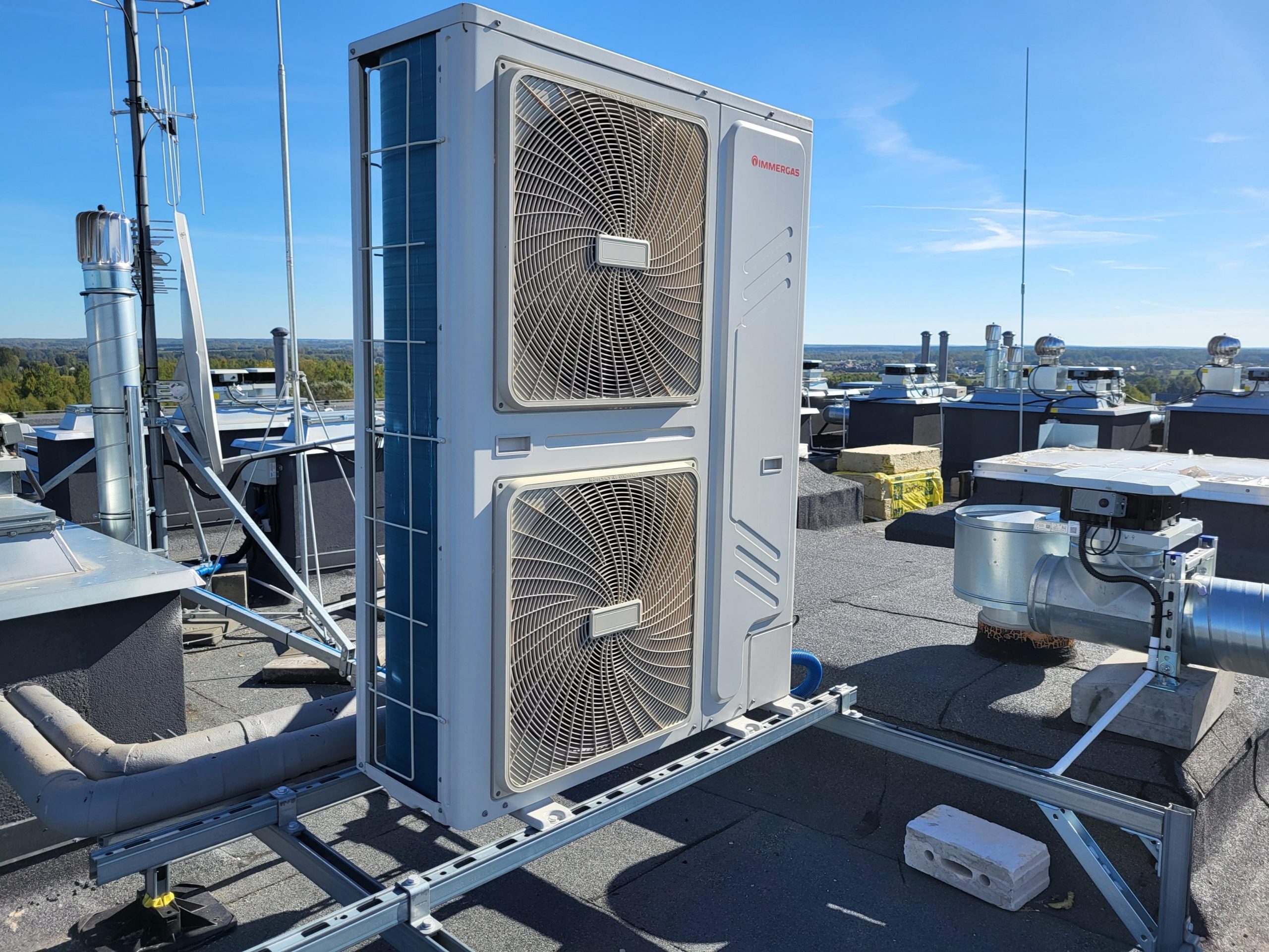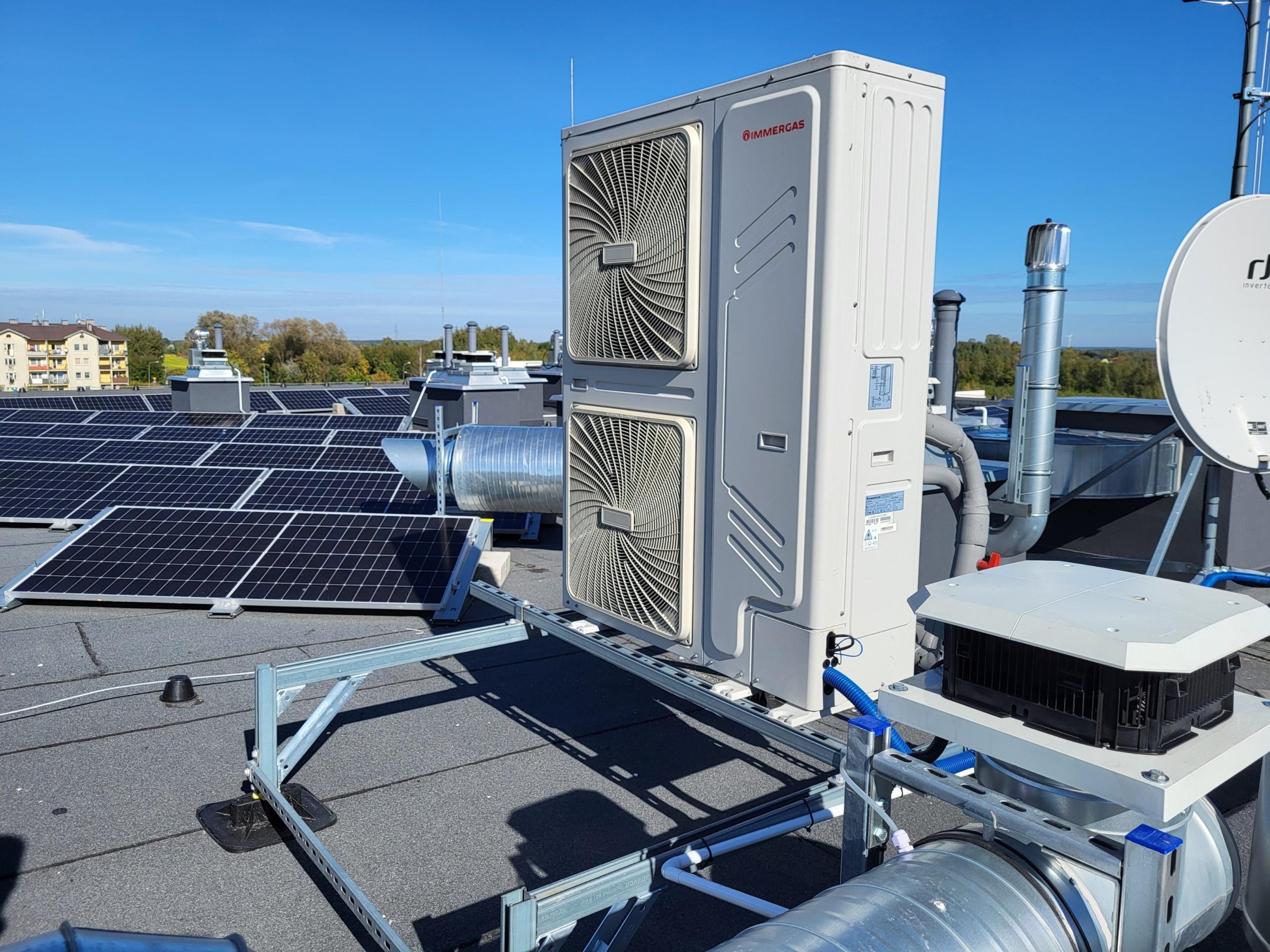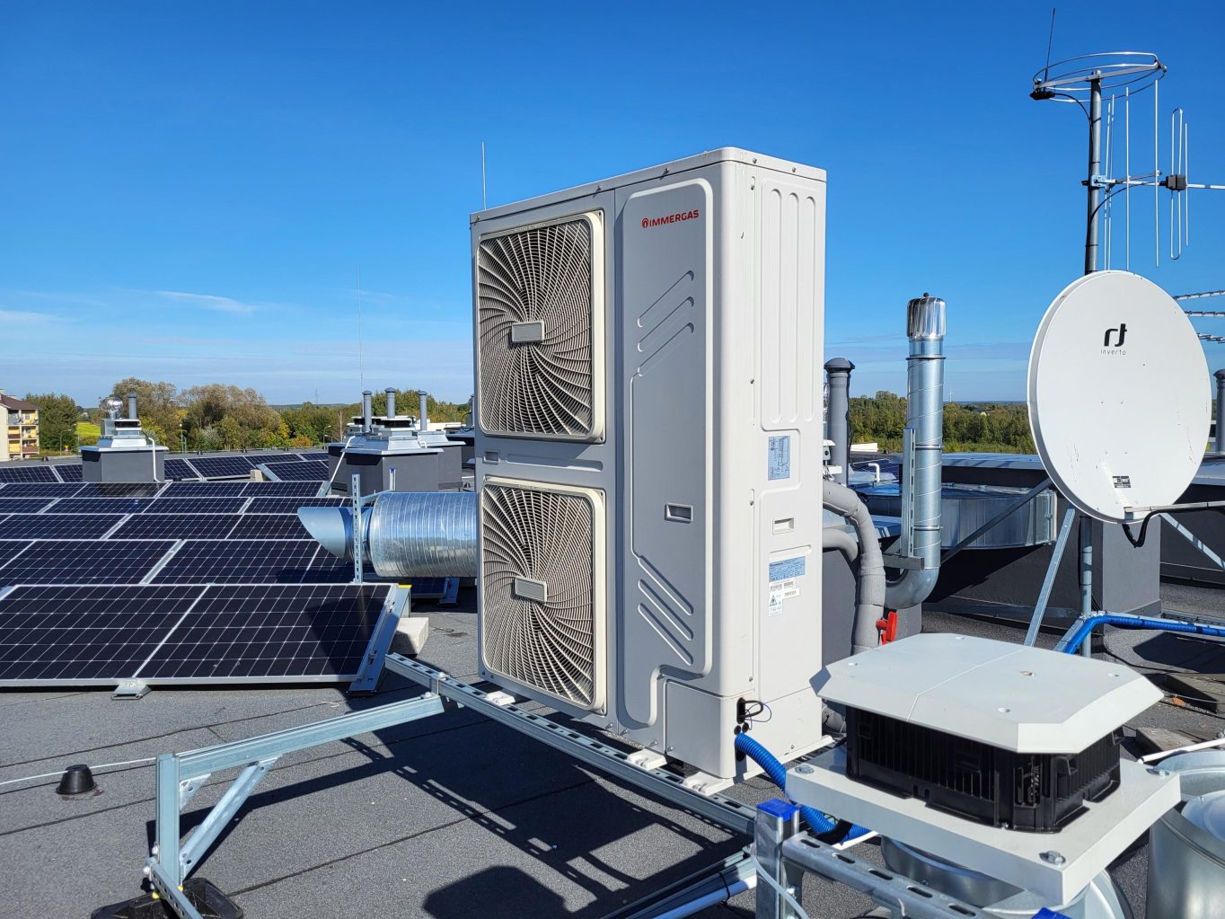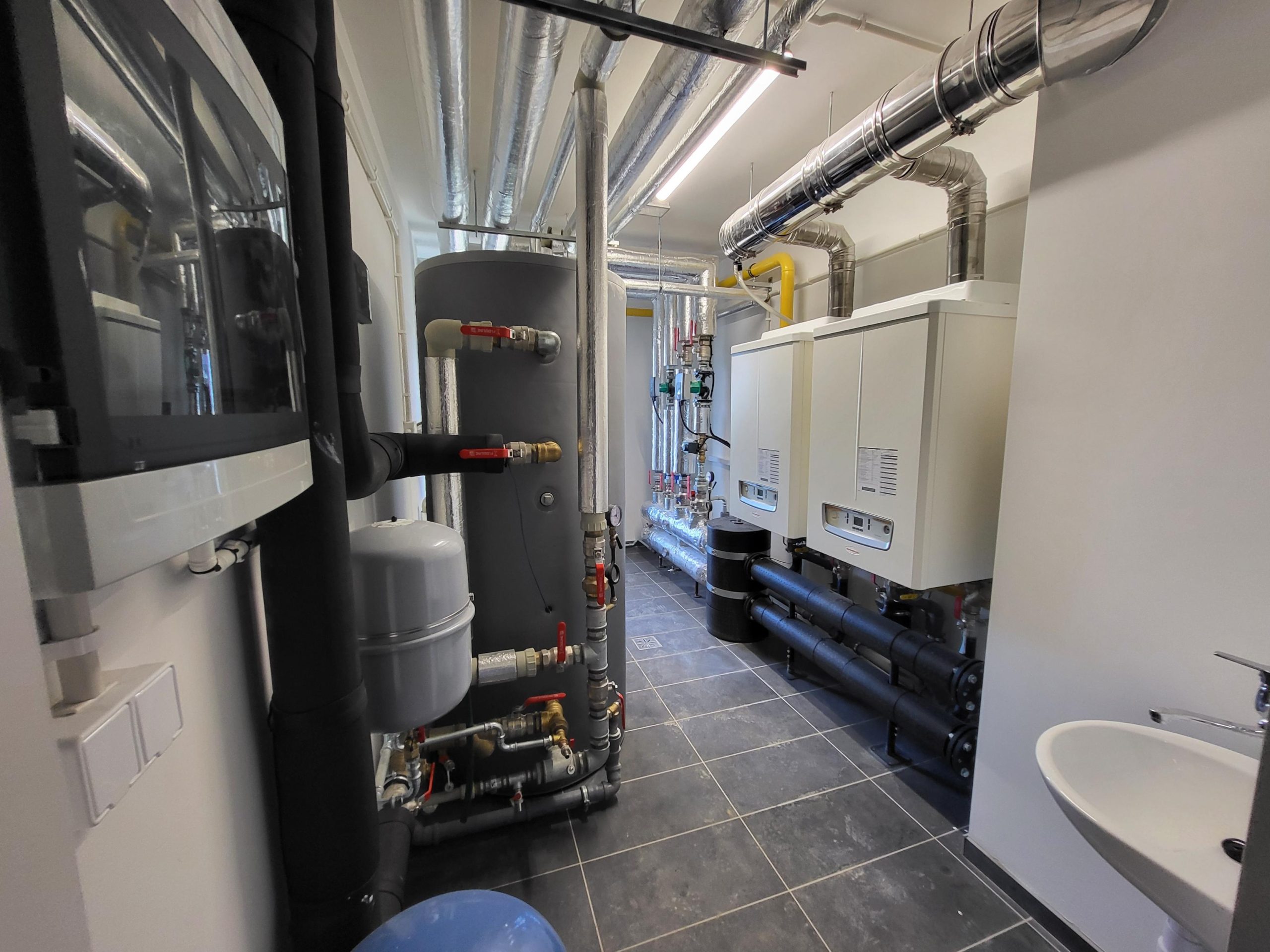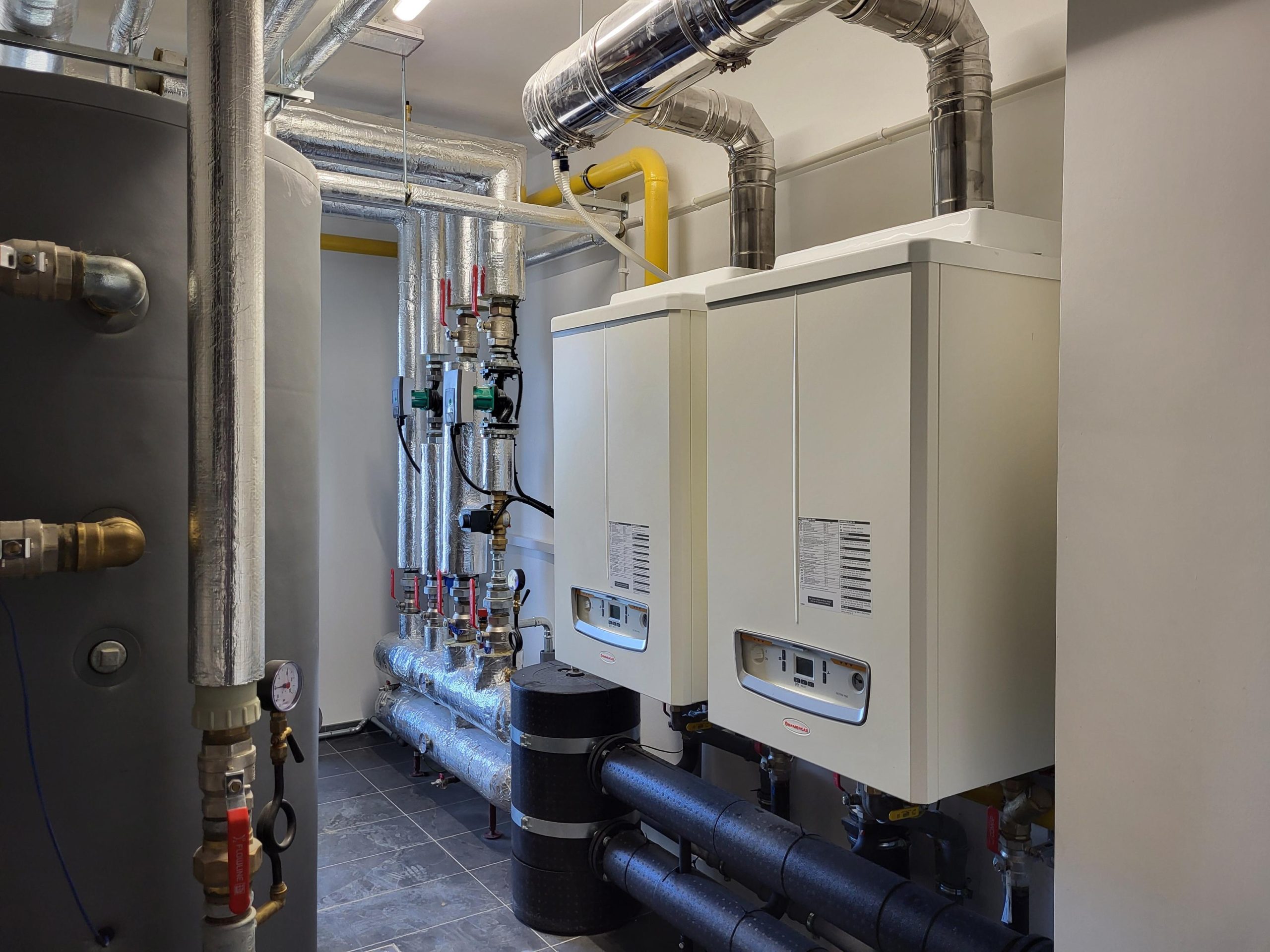 Instalacja grzewcza pracuje na cele centralnego ogrzewania w budynku mieszkalnym wielorodzinnym o powierzchni około 4000 m² oraz przygotowania ciepłej wody użytkowej dla 200 mieszkańców. Powietrzna pompa ciepła typu monoblok Magis M30 T zapewnia przygotowanie ciepłej wody użytkowej. System współpracuje z kaskadą dwóch kotłów gazowych Victrix PRO 100 ErP, które odpowiadają za ogrzewanie oraz wspomaganie produkcji c.w.u., zapewniając wysoką efektywność i niezawodność działania.