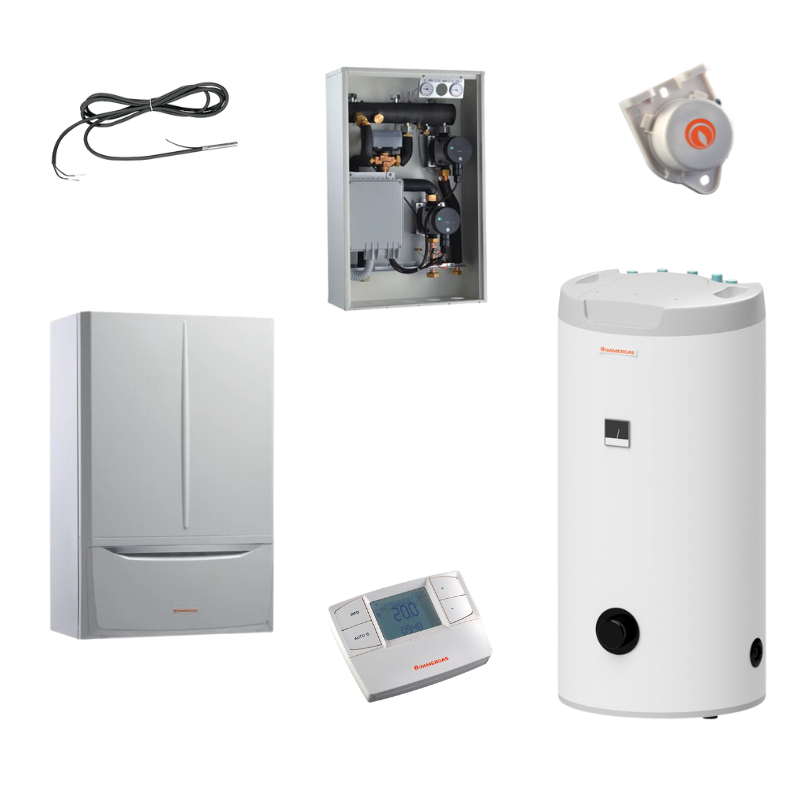 TERA 35 Komfort Plus 160 to zestaw z kondensacyjnym kotłem jednofunkcyjnym VICTRIX TERA V2 35 PLUS EU i zasobnikiem c.w.u. ze stali emaliowanej o pojemności 160 litrów i sondę temperatury do zasobnika. Dodatkowo zestaw zawiera termostat pokojowy