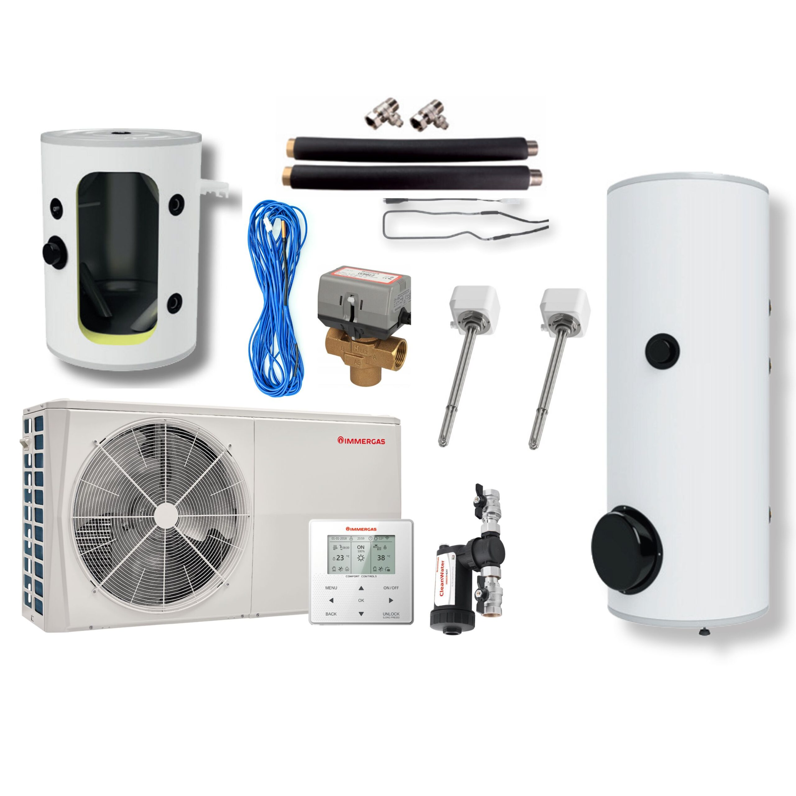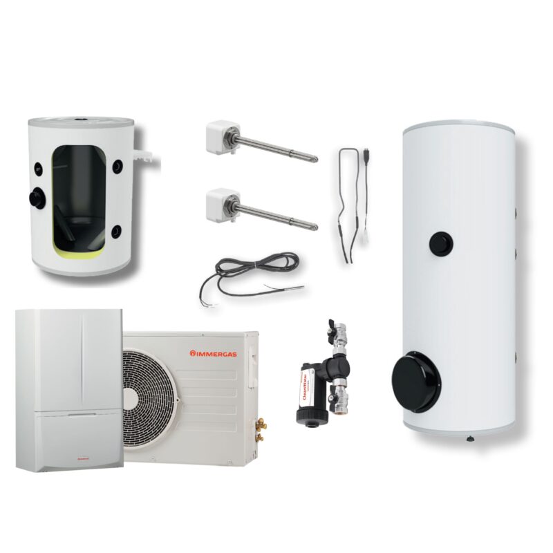 Magis PRO 4 V2 M200 B50 to zestaw składający się pompy ciepła typu split Magis PRO 4 V2, grzałki o mocy 3,3 kW do bufora, zasobnika c.w.u. o pojemności 200l z grzałką zasilaną jednofazowo o mocy 2,5 kW a także bufor do c.o. o pojemności 50l. Dodatkowo zestaw zawiera sondę do zasobnika, filtr magnetyczny z zaworami i zestaw ochrony antyzamrożeniowej do jednostki zewnętrznej.